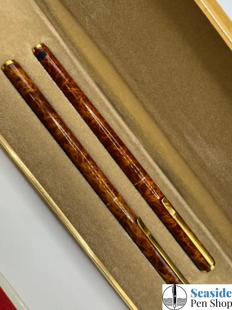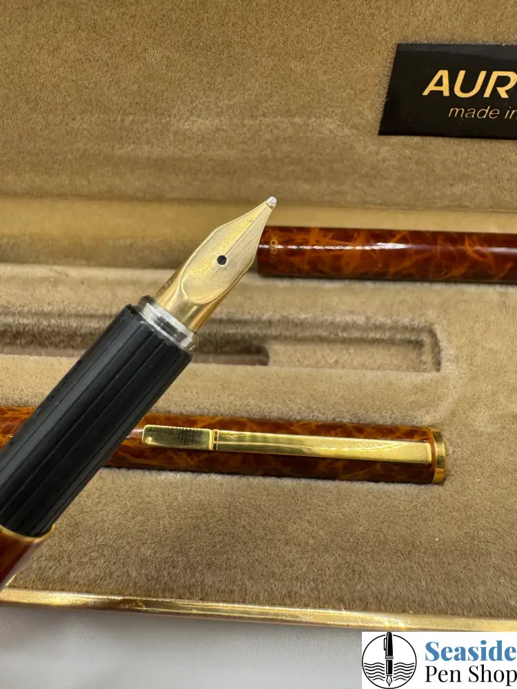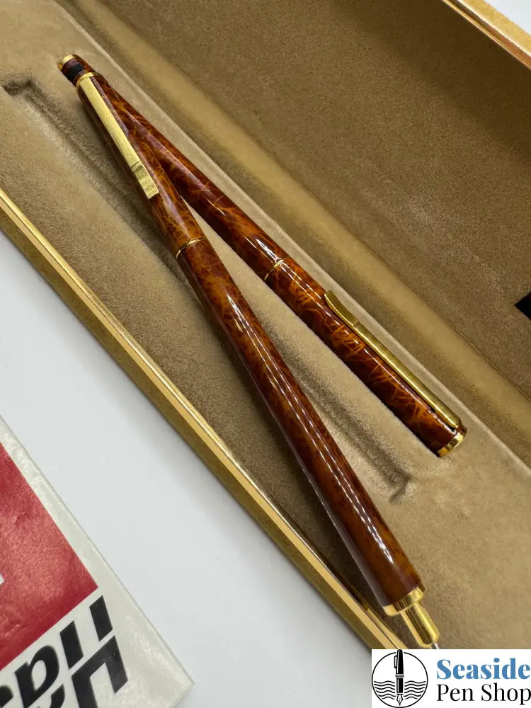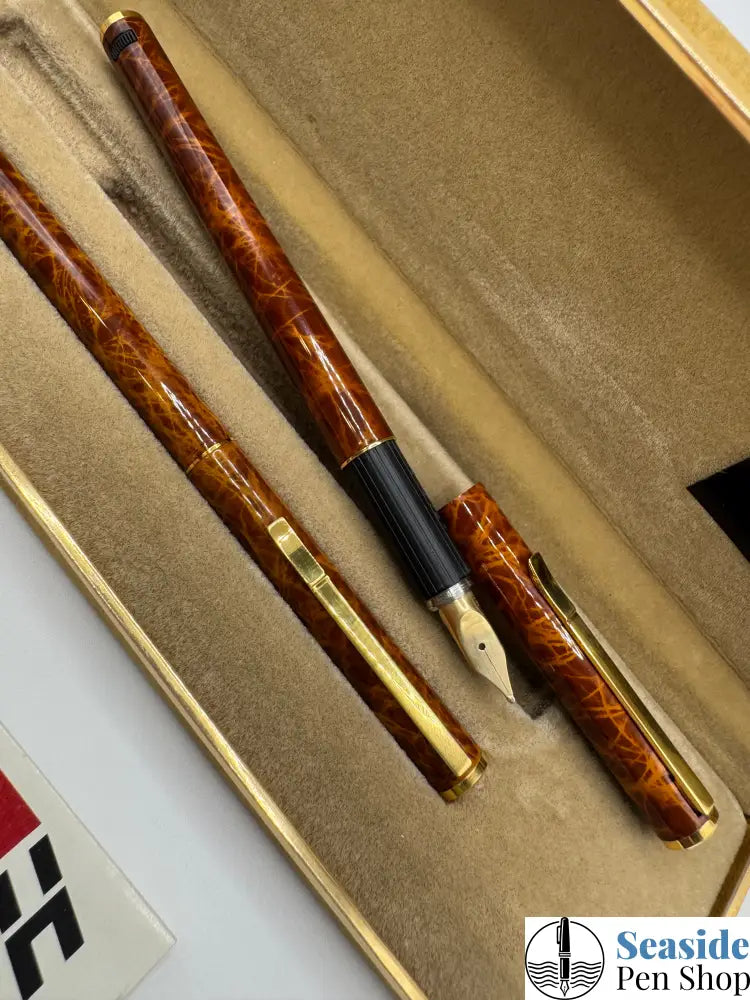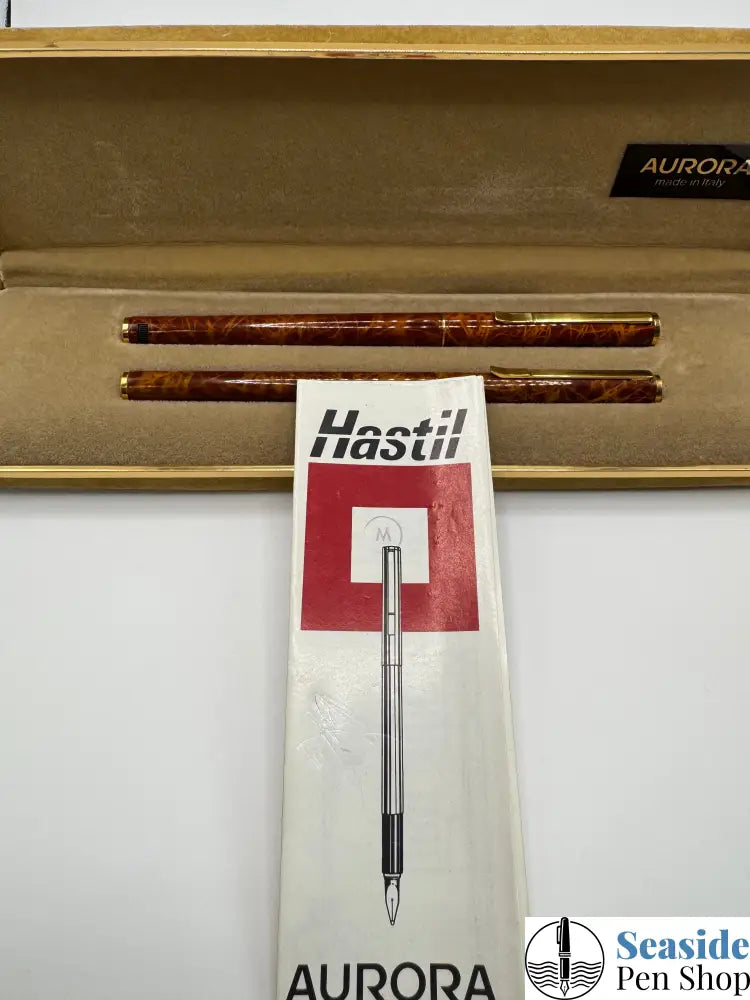 The Aurora Hastil is famously designed by Marco Zanuso, the Italian designed created a simple and elegant design. The set is tortoiseshell marble and the fountain pen is a cartridge/converter filler with what looks like a broad nib but the included paperwork is marked M.. The set appears to be unused, excellent condition. Includes original box.