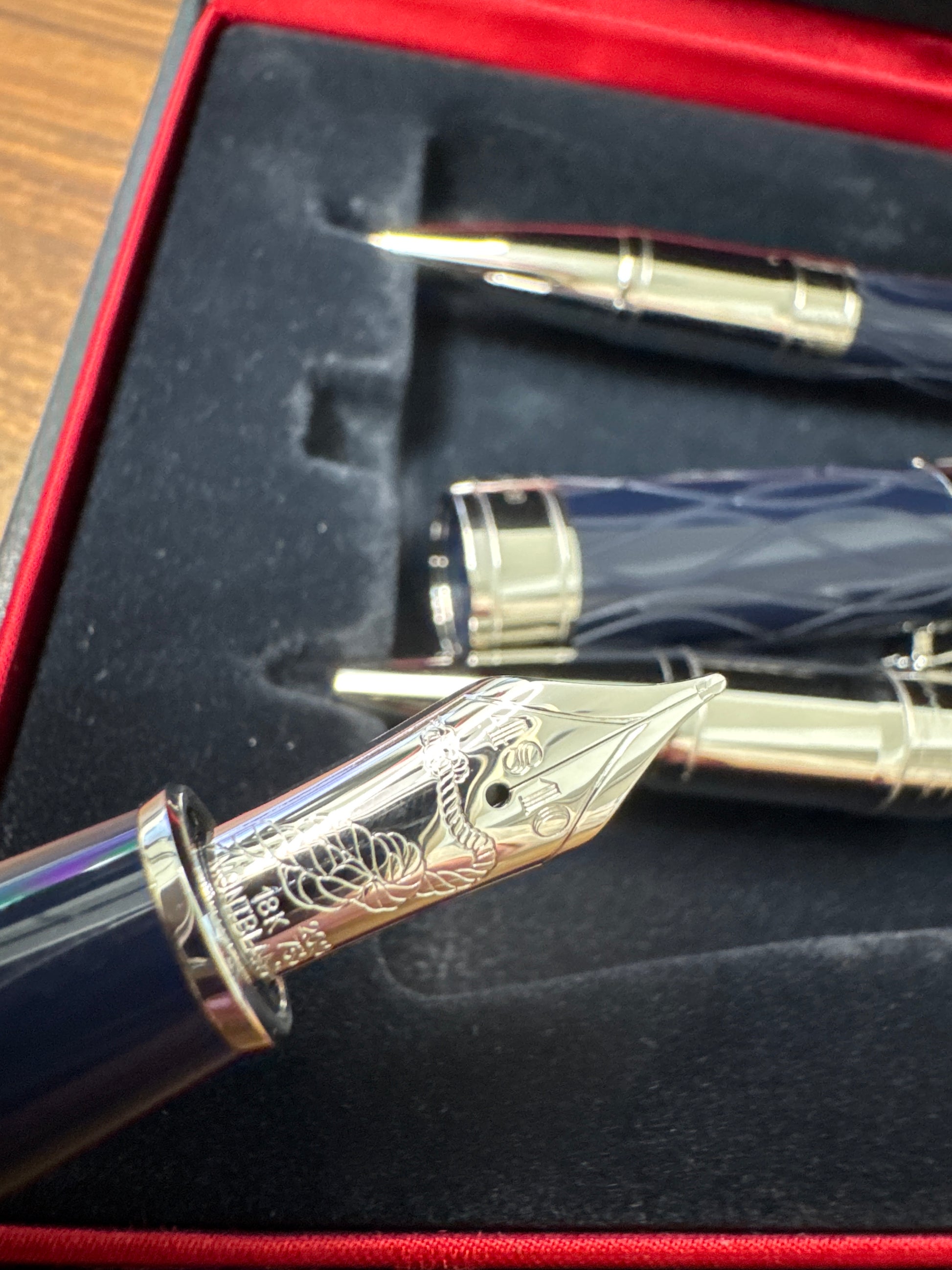 This Montblanc Writers Edition Mark Twain set appears to be unused and includes the original packaging. This numbered limited edition (1745) is designed to pay tribute to the river and steamboat themes of Marks Twains most famous writing. The pen body is a deep blue with a wave pattern and the fittings are platinum coated.