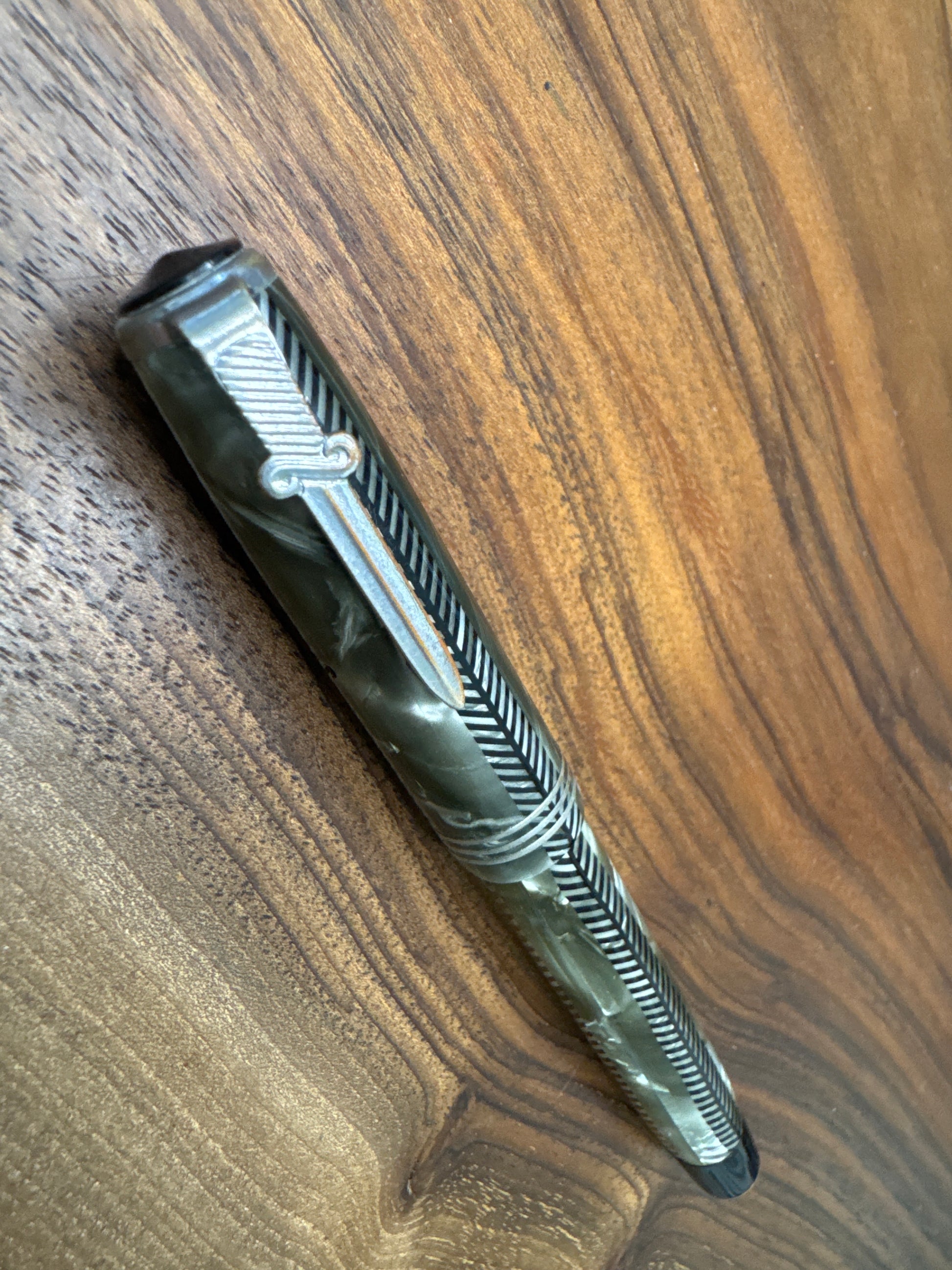 Parker Royal Challenger sword clip grey pearl and herringbone fountain pen, circa 1937. The Royal Challenger was Parker’s premier pen in the Challenger line with decorative clip and herringbone barrel design, this example the full size model with sword clip, barrel date code 2nd quarter 1937, grey marble with black herringbone pattern and gold trim with Parker Pen 14K fine nib Filling mechanism button fill. Overall good condition, some wear to trim. Filled and tested and writes beautifully.
