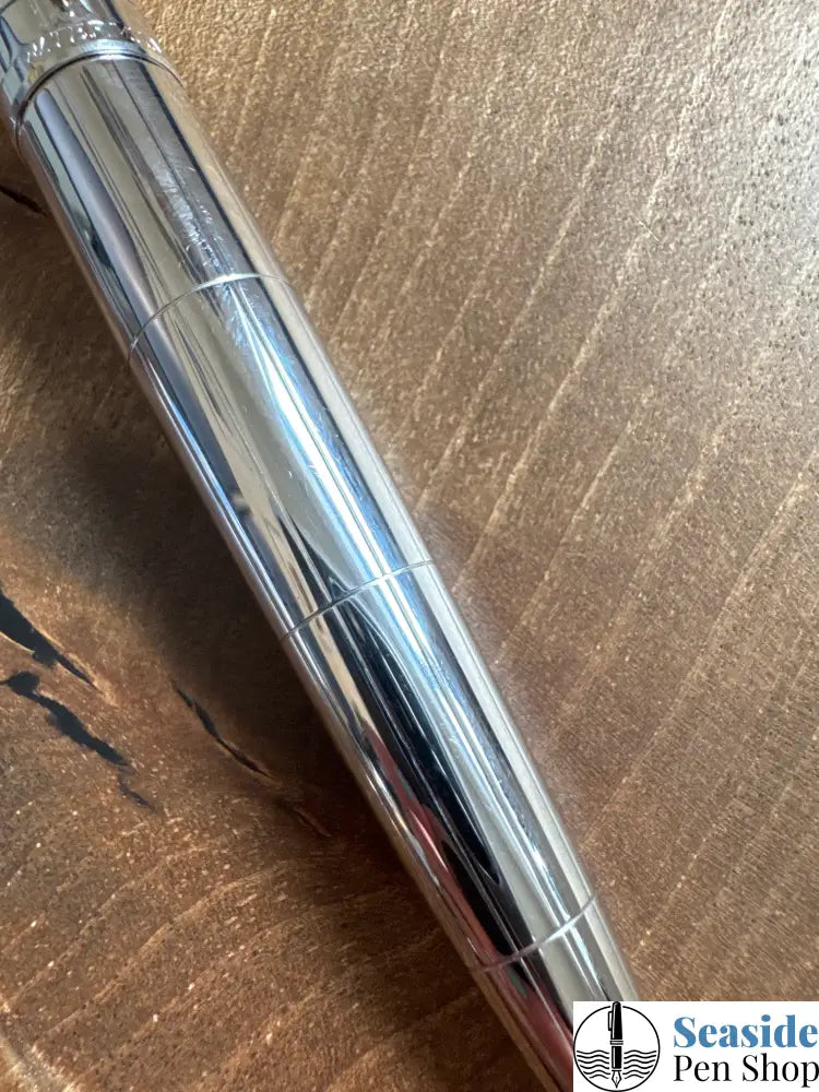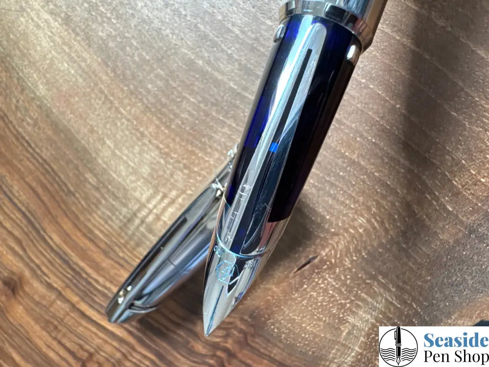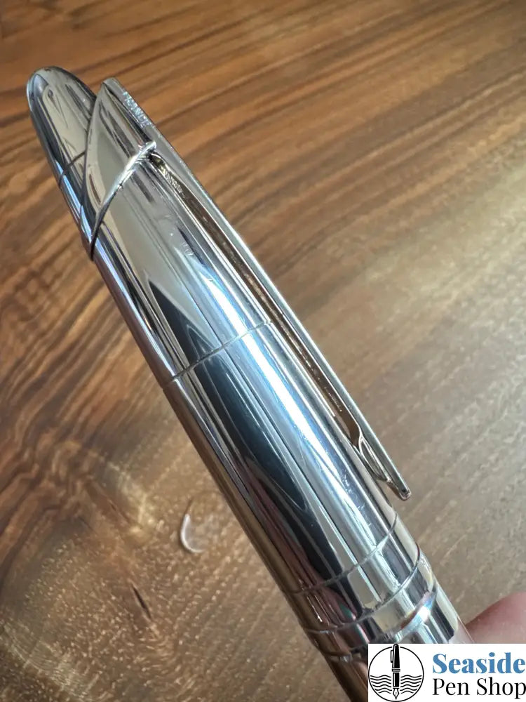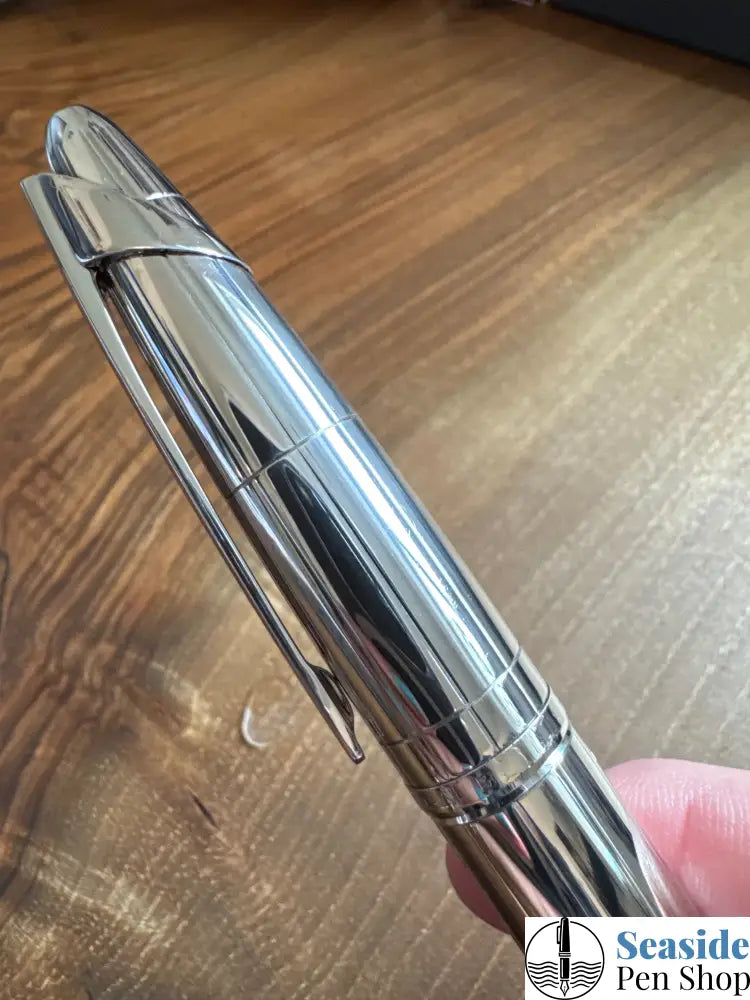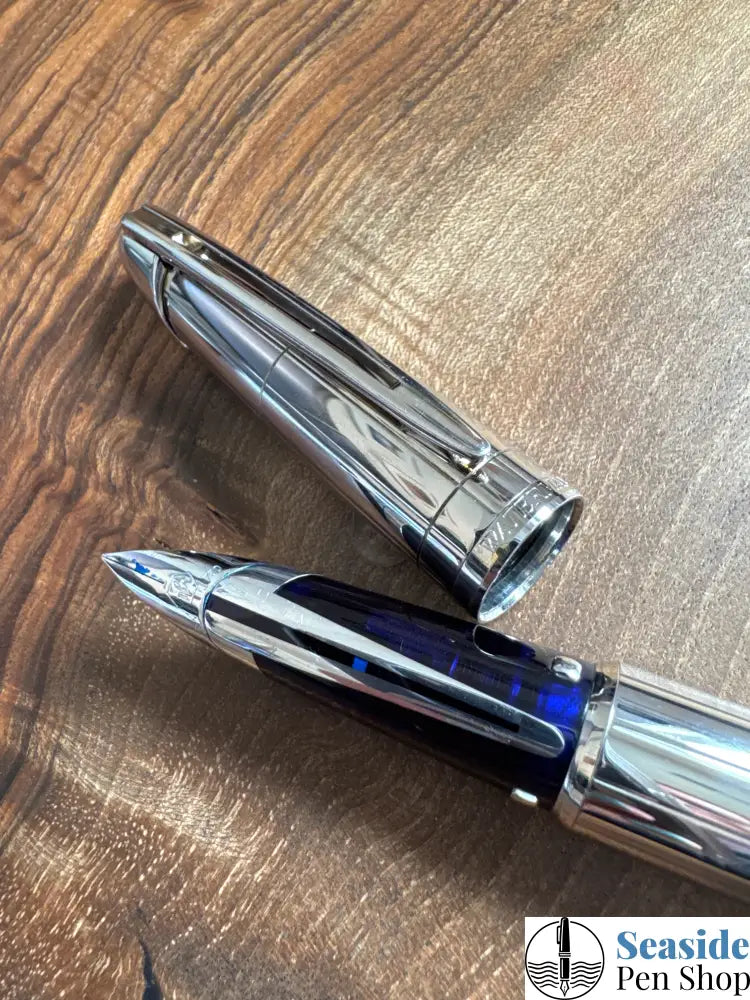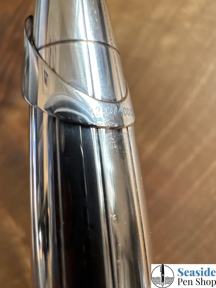 120th Anniversary (2004) Limited Edition palladium coated Sterling Silver Waterman Edson Fountain Pen numbered 1292/4000. This is a Large frame, heavy fountain pen and writes very smoothly. The grip section is blue and silver. No box or papers.