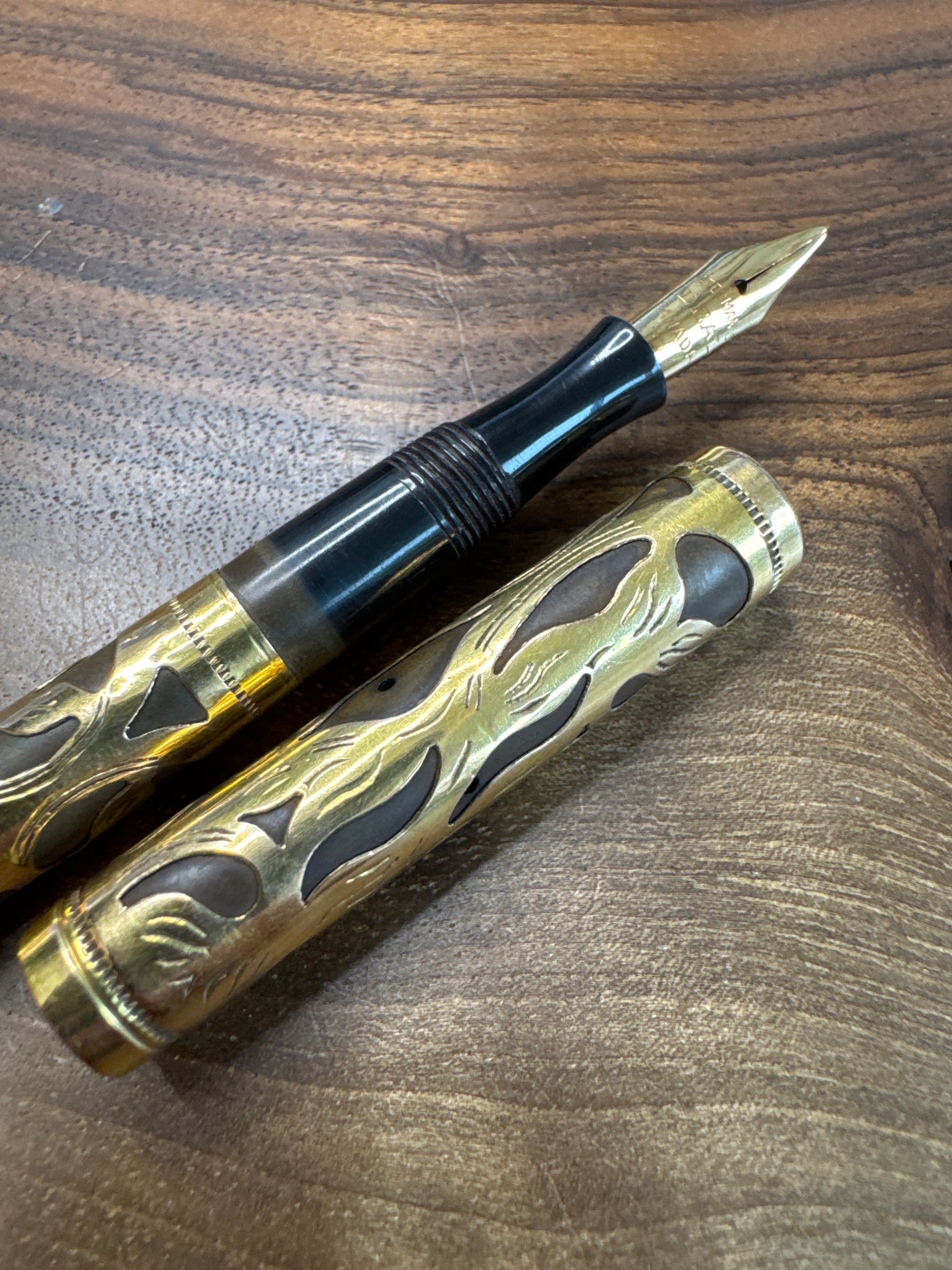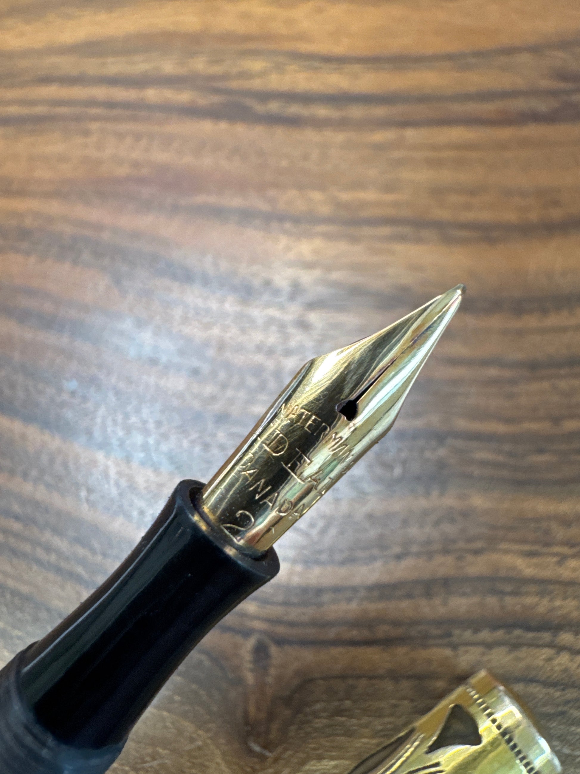 Waterman 0552 1/2 Gold Filled Filigree Clipless Fountain Pen with a new ink sac. The nib writes very well and is not overly flexible in a medium size. The nib is marked Ideal Canada and the barrel imprint is also Watermans Canada. Lever filling works well with a new ink sac. There is no engraving on the gold filigree. Discoloration to the pen body, appears as brown now where exposed to light.